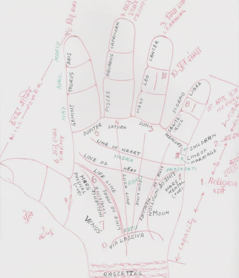 Video link :: https://youtu.be/p_JkEQzHBXQ MAJOR LINES :: (1). LIFE LINE :- It begins below the thumb over the junction of Mars & Jupiter. It indicate longevity & health. (2). LINE OF HEAD :- It indicates brain power, intelligence, prudence, skills etc. (3). LINE OF HEART :- It shows longevity, affections. (4). LUCK LINE :- It tells us about luck, rise & fall, problems etc. (5). SUN LINE :- It indicated name, fame, wealth, success. (6). MERCURY LINE :- Business, research, discovery, innovations etc. (7). HEALTH LINE :- It informs well in advance about the health of the possessor. (8). INTUTION LINE :- It describes intuition, foresightedness. (9). LINE OF MARRIAGE :- It shows the successful marriage, life of spouse, divorce etc. (10). SON :- Vertical line over line of marriage indicate son. Island at the root of thumb over Venus too shows son. Broken line shows death of miscarriage. (11). DAUTHTER :- Small line over the line of marriage. (12). TRAVEL :- Long distance travel, abroad etc. (13). MARS LINE :- It supports the bearers till its present. Protects from accidents too. INFLUENCE LINE :: (14). POSITIVE INFLUENCE :- It shows guidance support from parents, Guru, elders etc. (15). NEGATIVE INFLUENCE :- it indicated bad company, foul impact, even evil company. (16). RASCETTE :- It shows longevity etc. (17). SPECIAL LUCK LINE :- One will definitely become rich due to hard work-labour, efforts. MINOR LINES :: RINGS :: (18). Solomon's ring shows that bearer may become an administrator but he will have to walk over swords edge. He may be religious as well. (19). Saturn girdle checks the accumulation of worldly possessions and & success. (20). Sun girdle creates hurdles in the success, name fame and riches. (21). Mercury girdle checks the progress of the possessor in the field of sciences, research, innovations. (22). Venus girdle shows that the possessor may have venereal diseases, if broken. A girdle is a negative sign. (23). Vertical lines over Mercury shows balanced expenditure, innovations, research. (24). Mystic cross shows that the person may possess mystic powers. (25). Vertical lines over the second phalange shows friends & sons. (26). Horizontal lines over the second phalange phalange enemy, competitors. (27). On right hand over Venus & percussion big line brothers, small sisters, broken lines dead brothers & sisters. In the left hand uncle & aunts. (28). This small down ward line, heading towards right shows sudden death. It may start from Mercury showing 10-21, from Sun 21-28 to 49, from Saturn 49-56 to 77 & from Jupiter 77-84 to 105 years of age. |