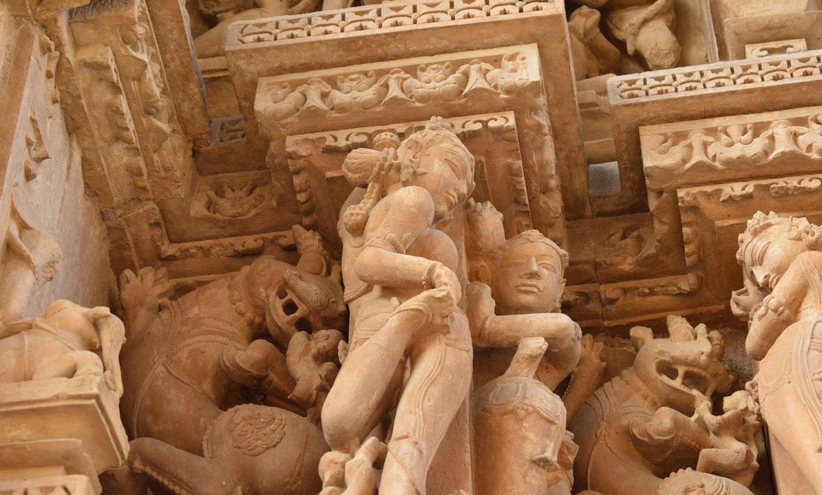 (2). SEXUAL UNION (-Samprayogik, संप्रयोगिक, embraces, etc.) :: The second section of the Kam Sutr consists of ten chapters on the stimulation of desire, various forms of embraces, caressing and kisses, marking a partner with the use of the finger nails, biting and marking a partner using the teeth, on positions of copulation, explanations of sexual practices such as slapping with the hand and moaning that accompanied the practice, evidence of virile behavior in women, superior coitus and oral sex practices, along with preludes and conclusions to the game of love. There are 64 types of sexual acts described in this section which has become the part of it.